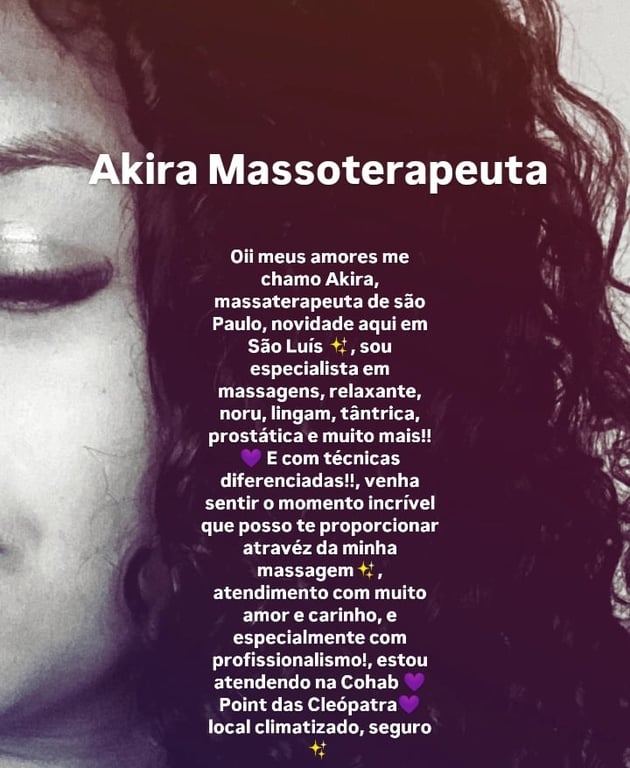 Oii meus amores me chamo Akira, massaterapeuta de são Paulo, novidade aqui em São Luís , sou especialista em massagens, relaxante, noru, lingam, tântrica, prostática e muito mais!! E com técnicas diferenciadas!!, venha sentir o momento incrível que posso te proporcionar atravéz da minha massagem, atendimento com muito amor e carinho, e especialmente com profissionalismo!, estou atendendo na Cohab Point das Cleópatra local climatizado, seguro